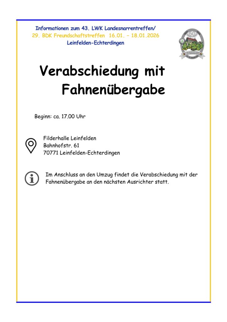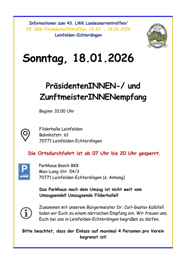 Wir laden die Präsidenten/Präsidentinnen, Zunftmeister/Zunftmeisterinnen und närrische Hoheiten herzlich zum traditionellenn feierlichen Empfang in die Filderhalle ein.